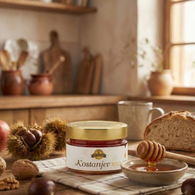 Kostanjev med je med preverjene kakovosti, ki je grenkega in močnega okusa. Je naravni čebelji pridelek, pridelajo ga čebele. Mi mu nič ne dodamo in nič ne odvzamemo. Je bolj tekoč med, z značilno temno rjavordečo barvo, ki redkeje kristalizira. Vsebuje veliko zrnc cvetnega prahu, kar mu daje grenki okus in posledično je njegova vitaminska vrednost večja kot pri drugih vrstah medu. Zaradi tega je kostanj za čebele pomembna medovita rastlina, ki cveti od junija do začetka julija. Je občutljiva drevesna vrsta za medenje. Če v času medenja kostanja preveč dežuje, pomeni slab donos s paše, če pa je vreme ugodno, toplo in mirno, pa bomo natočili veliko kostanjevega medu. Je eden izmed značilnih medov za Prekmurje in spada med najbolj iskane vrste medu, pripisujejo mu veliko pozitivnih učinkov.